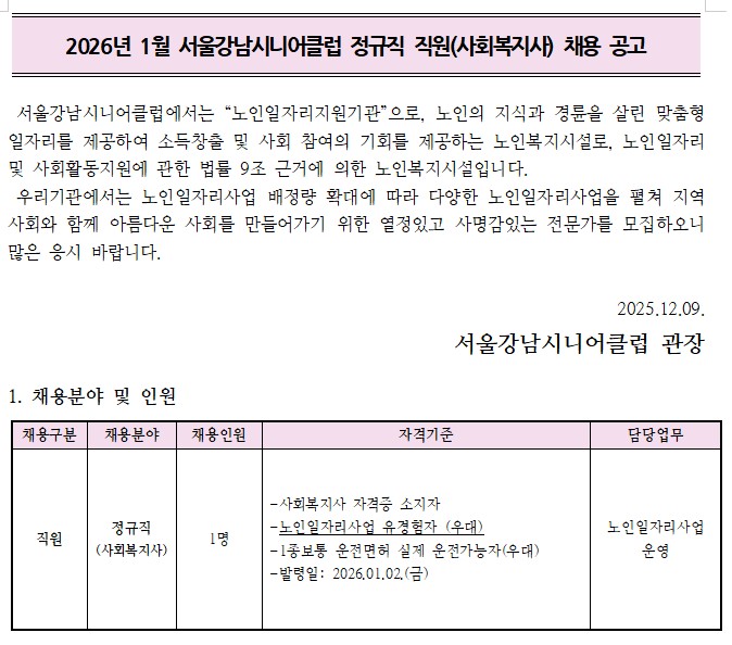 2026년 1월 서울강남시니어클럽 정규직직원(사회복지사) 채용 공고