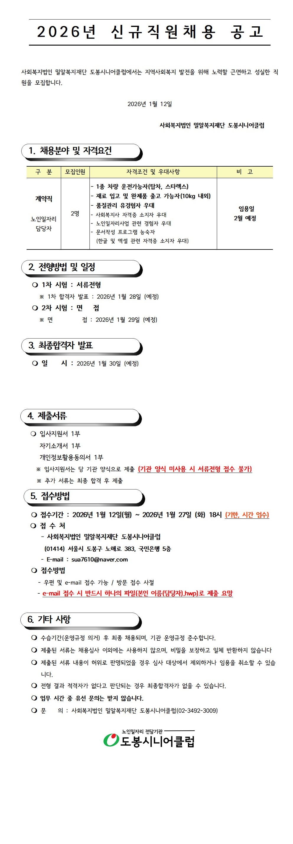 2026년 1월 도봉시니어클럽 신규 직원 모집 (노인일자리 담당자)